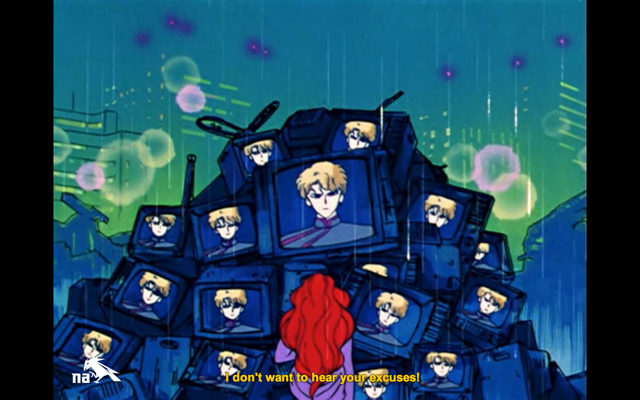 Meanwhile, Jadite chastises Kyurene for letting the tape slip through her fingers twice now, and yeah, seriously Kyurene. You might be the scariest looking monster of the week since Episode 1, but you’re also being about as effective as Tuxedo Mask.