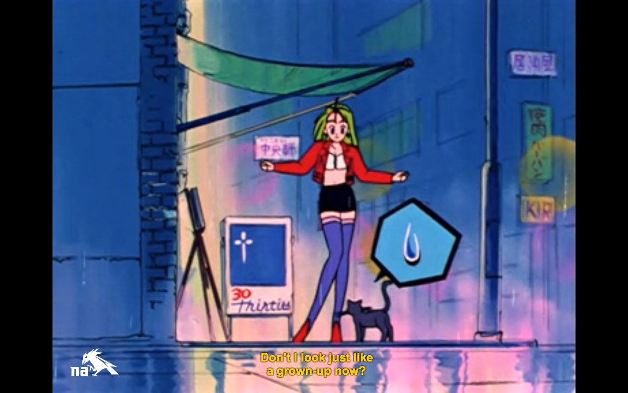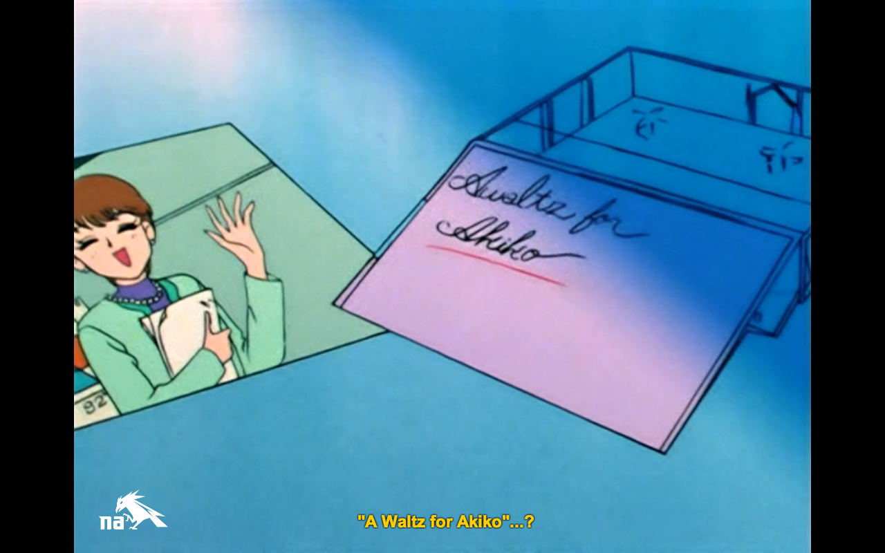 For his part, Yusuke plans to finally tell Akiko that he has feelings for her, but chickens out when she’s called back up to the studio without even noticing that the title of his new song is “A Waltz for Akiko.” Dejected, he starts to walk home in the rain, like the protagonist of any good romantic comedy in its third act. Kyurene follows.