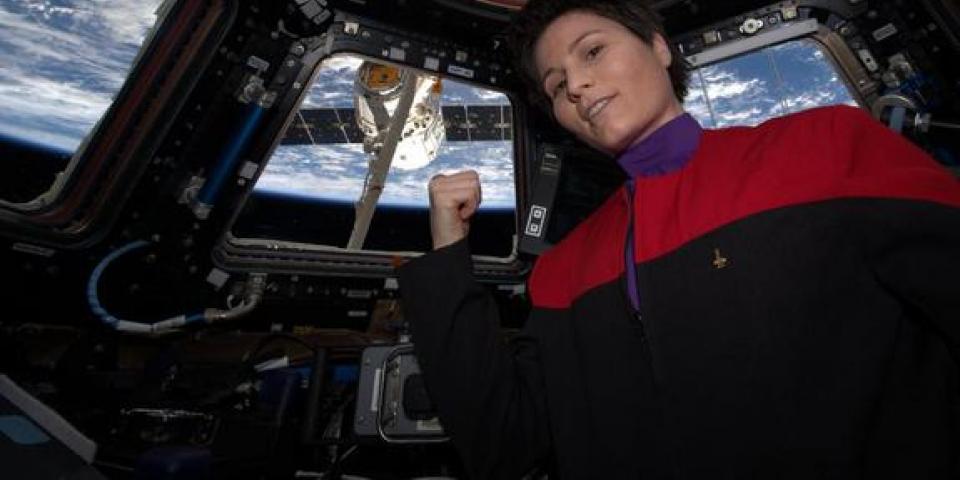 Sometimes, it pays to wear your favorite Starfleet uniform when taking selfies in outer space. We’ve known for a while that Italian astronaut, Samantha Cristoforetti, who’s currently aboard the International Space Station, is a huge nerd. So much that, on one occasion, she did her best Janeway impression in the above photo. Well, it looks like all that in-uniform camera prep paid off!