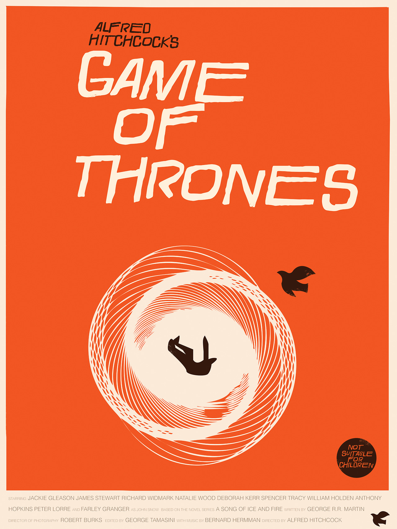 Yesterday, legendary designer and filmmaker Saul Bass would have been 93. Everyone celebrated in their own way – Google made a doodle in honor of him and artist Fernando Reza created a unique tribute. He created Game of Thrones posters in the Bass’ unique style. He writes, “Each poster commemorates one of Saul Bass’ frequent collaborators Otto Preminger, Stanley Kubrick, Alfred Hitchock, and John Frankenheimer. Each with visual cues to some of Bass’s most iconic works. This also opened the door to envisioning what a Hitchcock/Kubrick/Preminger/ Frankenheimer adaptation may have been, so each print comes complete with prospective cast and crew info at the bottom.” A very small print run of each design is available today on his website.