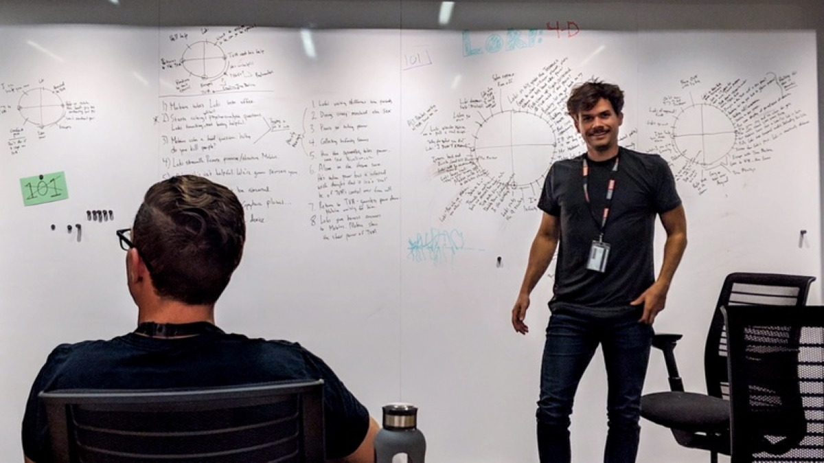 According to The Direct, there’s a shot in the documentary where head writer Michael Waldron is standing in front of a whiteboard that is full of ideas (this is about eight minutes in). As the camera zooms in, you can see different bullet points that have Loki visiting different time periods, gaining more power, and taking part in, quote, “mischief.”