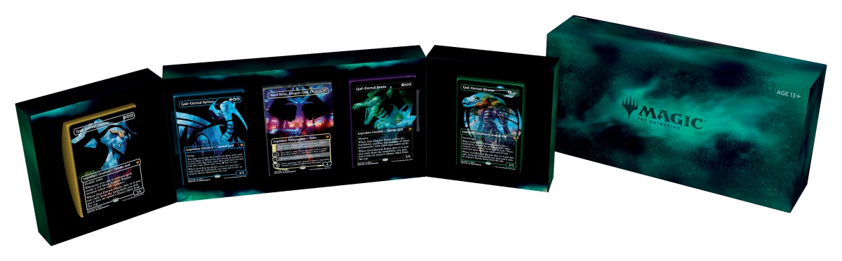 “This special collection will have limited-availability at SDCC and features Nicol Bolas and the four God-Eternals from War of the Spark presented in premium, cinematic packaging. There will be beautiful exclusive artwork by Adam Paquette that complements special frame treatments.”