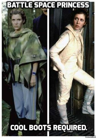 Princess Leia was one of the first female characters I saw as a young child who made me want to BE her. She’s sarcastic – me too! She’s a Space Princess – I WANT to be a Space Princess! She’s a crack shot with a blaster, and she helps to lead a Rebellion against the Galactic Empire. Although she is first shown in her iconic white dress, she is later shown wearing – you guessed it – awesome boots and cool pants. And vesty-things. My love of boots and vesty-things was born from love of Princess Leia, as was the spark of my imagination that wanted to be an action princess in charge of a rebellion. Leia was the beginning of the space-lady love for me, and if I ever get to meet Carrie Fisher, I’ll tell her so and thank her for her portrayal of a sarcastic, crack-shot space princess with awesome boots, a sassy attitude, and the coolest job in movie history.