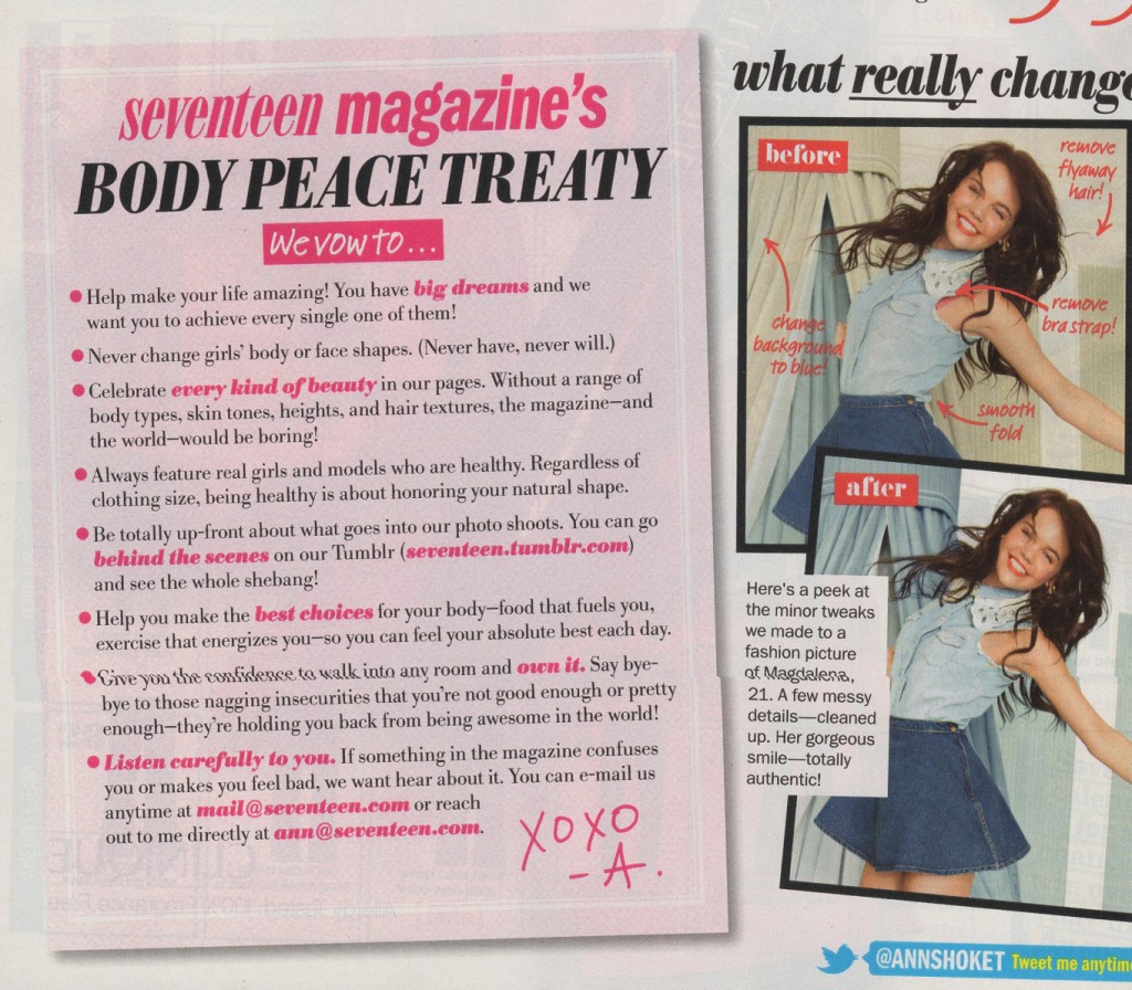 The battle against photoshop in women’s magazines is not new; it’s been waging for decades, and has become especially heated in the last ten years. For the most part, though, the forces on either side of the debate have been in a stand-off for some time, sometimes nudging towards acknowledgement of the other’s validity, but never really getting anywhere long-lasting. When it comes to Seventeen magazine, that paragon of idealized (read: airbrushed) teen splendor, it fittingly took an actual teen voice (and the voices of the 84,000 people who stood behind her) to break through and take what could be one small step for the human image, one giant leap for Seventeen magazine.