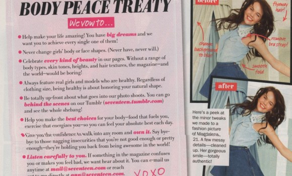At first the magazine responded with a sort of “good job kid, better luck next time” approach, but things seem to have changed now. Revealed in their August issue, Seventeen published an eight-point “Body Image Treaty,” pledging their commitement to “celebrat[ing] every kind of beauty.” This includes, according to their vow (which can be seen in the image above):