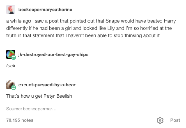 Leaving aside the fact that this handwaves over the idea that it’s somehow acceptable for a middle-aged man to hate an innocent child for his parentage and gender, it’s still hugely creepy to consider that if Harry were a girl, Snape’s treatment of her would have been so different.