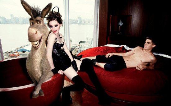 In honor of the coming premiere of Shrek Forever After at the Tribeca Film Festival, V Magazine’s male counterpart VMan is running … a series of sexy Shrek pictures. Featuring characters from the film series posing with scantily clad models.
