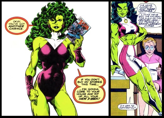 Jen got a new series again in 1989, entitled Sensational She-Hulk. Already experienced in handling the character from when she’d been a star in Fantastic Four, John Byrne started off as the writer/artist of this series. Unlike the previous She-Hulk series, this title didn’t delve into Jennifer as a character who led two lives. You see, for one thing, Jennifer had gone public about her She-Hulk identity around the same time that she joined the Avengers. Then, during her time with the Fantastic Four, a further exposure to radiation led to her being locked in her green-skinned body. Rather than lament that she was stuck as her superheroic self, Jennifer decided she preferred it, remarking that she hadn’t been fond of her shorter, physically weaker, slightly more inhibited self anyway. In Sensational She-Hulk, this created a rift between Jen and her father, who wondered at times if this was still the daughter he had raised.