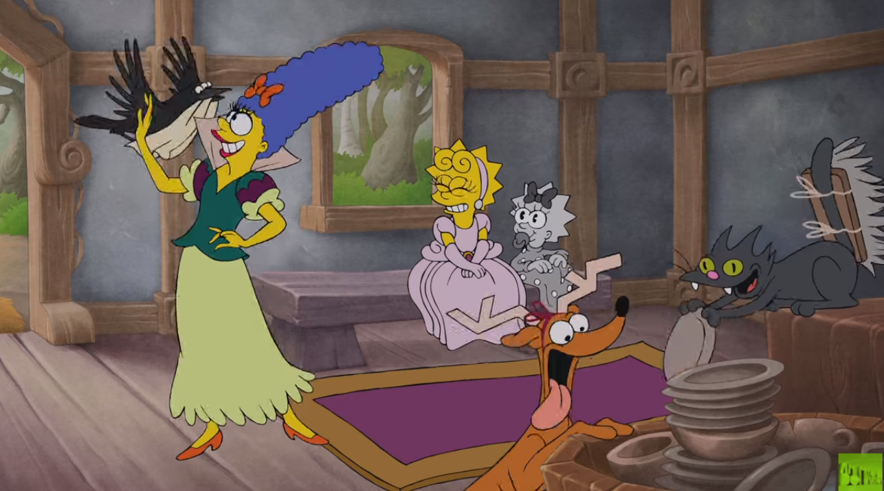 The animation references Disney films like Cinderella, Snow White and the Seven Dwarfs, The Jungle Book, and Fantasia, and casts every Simpsons character in pretty appropriate roles—Marge is the put-upon Snow White, Homer is Baloo the Bear, Bart is the sorcerer’s apprentice (from Fantasia, not the terrible Nic Cage movie), and Lisa is Cinderella. I feel like Lisa might object to some of the tropes present in Cinderella’s story, but otherwise, A+ casting.