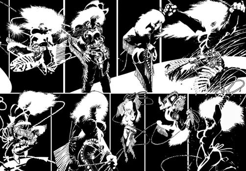 Many avid readers (like moi) of old-school pulp noir like Raymond Chandler joints were surprised to see the reality of the graphic novels that’d been hyped as an homage to the genre. Archetypal bad guys, flawed heroes, and dangerous femme fatales were stripped back in Sin City to forms so simplistic they’re almost unrecognizable as being related to standard noir types. The pencilling backs up the rudimentary characterizations here—meat-head criminals have oversized fists and hulking shoulders to delineate their capacity for violence, and the women are stripped down to component physical parts, too. Child-torture-victim-turned-erotic-dancer Nancy Callahan, for instance, is drawn as a collection of round breasts, pointed nipples, lips, hair, and glazed eyes. And the other female characters don’t fare much better on that front, or in what they’re clothed in by their creator. Unfortunately, the only store serving the female population here appears to be an S&M-themed Fetish Wear Emporium, which must totally suck in winter.
