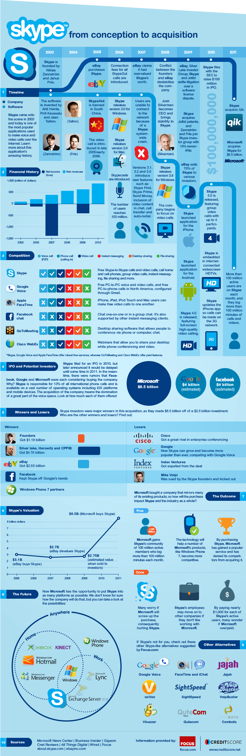With the famous video-phone service Skype now in the hands of Microsoft, you might be wondering about its origins and how it came to be worth nearly $9 billion in the eight years since its creation. This infographic covers the history of the company, and the software, that has let people from around the world talk to each other face to face and took phone sex to a whole new level.