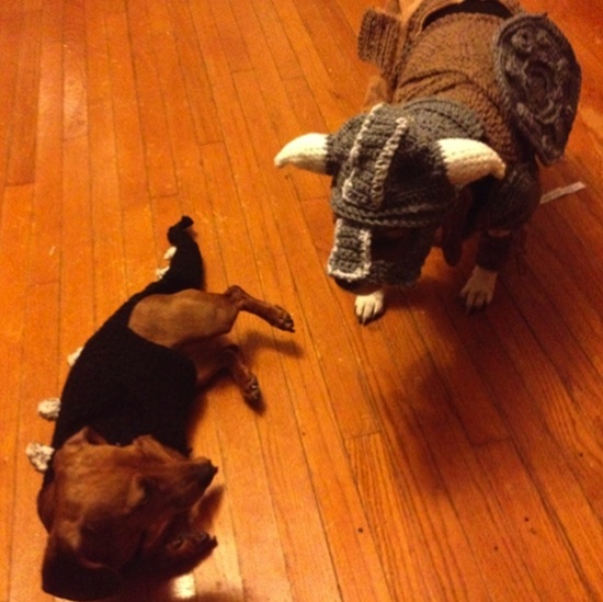 Halloween may be months away, but it’s never too early to start dressing up your dogs. Take this handsome pair, for instance, dressed like a dragonborn and a dragon from fantasy video game Skyrim. A hand crocheted labor of love, the outfit includes a helmet, sword, shield, and bracers. Also, that’s a dachshund dressed as a dragon. What more could you possibly want? See more pictures of this pair, and their costumes, after the break.