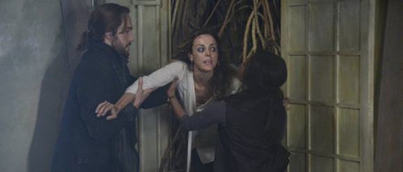 The emotional moment is interrupted by a scream from Lena, who’s in the hands branches of the evil Ent. At Ichabod’s suggestion Abbie starts shooting the roots that are all over the room, which hurts the Ent and makes it let go of Lena. Yeah, teamwork! Abbie sees another vision of Grace leading Katrina and her son out of the house through a secret tunnel, so she in turn gets Ichabod and Lena out the same way.