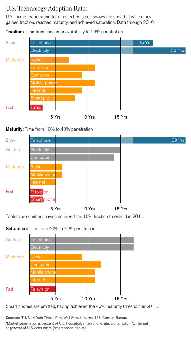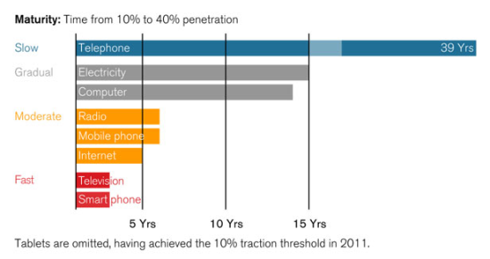 In any event, it’s all a little unclear because smartphones have yet to reach 75% market penetration, but unless something happens to stop them, they are bound to reach it faster than any other technology. That’s really saying something, considering how long it took, say, telephones and electricity to permeate. Then again, smartphones don’t necessarily require much extra infrastructure over mobile phones in general, which really enables a speedy climb. I hope you love your smartphone; it isn’t going anywhere.