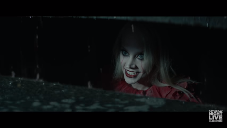 Last night’s Saturday Night Live (SNL), hosted by The Big Sick writer and star Kumail Nanjiani, took aim at both Kellyanne Conway and the news shows that continue to invite her on-air. Kate McKinnon was back in all her manic glory as Kellywise the Dancing Clown, an It-inspired parody of Conway’s toxically symbiotic relationship with left-wing media. Down in the sewers, Pennywise-style, McKinnon’s Conway tempts Alex Moffat’s Anderson Cooper to put her on TV: “Don’t you want a quote? I’ll give you a quote. I’ll give you a crazy, crazy quote.”