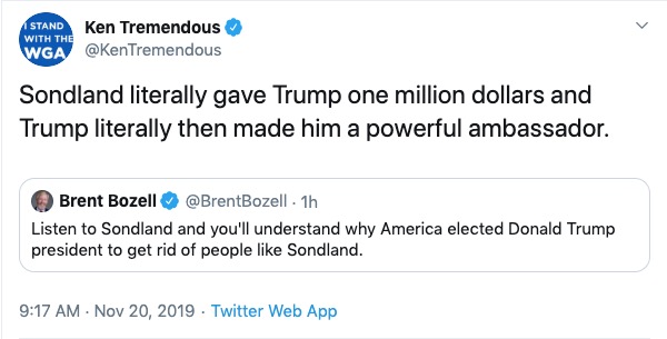 It’s not surprising that ignorance is Sondland’s only believable defense. He’s not an experienced diplomat. He owns a bunch of hotels and got this position after donating a million dollars to Trump’s 2016 campaign. Now he’s part of the “three amigos” who, along with Rudy Giuliani, are reportedly determining our entire foreign policy with Ukraine.