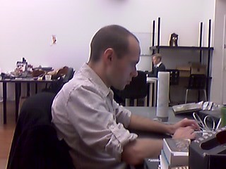 Before we got to breaking it, we tried using it as an actual phone. It’s email-capable, but the small screen and physical keypad meant we didn’t want to do any emailing on it. It looks like the kind of phone that would have Snake installed, but it doesn’t. There is a camera, but it’s not great. Here are some photos Dan Van Winkle and I took of each other to test the camera: