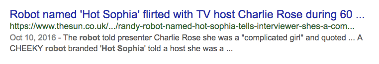 Yup! Sophia is already deemed “hot” because … well, she’s shaped like a woman and modeled after women, so her appearance is immediately a matter of concern and part of her initial descriptives—as though it wasn’t enough that she’s a freakin’ robot with a range of 62 facial expressions and an impressive ability to speak and reason. Sophia’s been in the news for a while, and this kind of language about her isn’t new: