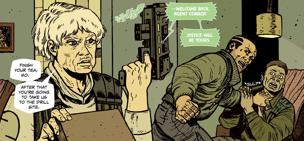 With its new protagonist, the tenor of Southern Cross reorients away from the quiet, creeping dread of a horror noir to a full-fledged action/adventure sci-fi story, complete with futuristic weapons and good, old-fashioned bloody beatings. It’s unclear where Hazel’s loyalty lies in all of this. She’s obviously in a position of relative power on Titan, but she doesn’t seem the type to toe the line for a corrupt corporation or an organized crime ring, so why exactly is she taking up this cause? It could just be the savior complex of a former cop, but Cloonan embeds clues in the issue that suggest there’s more to Hazel’s past than just detective work. Whatever her reasons, it’s exhilarating to see an older woman treated like a complex action hero.