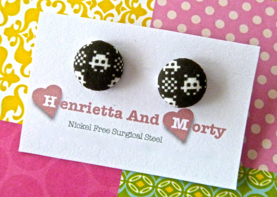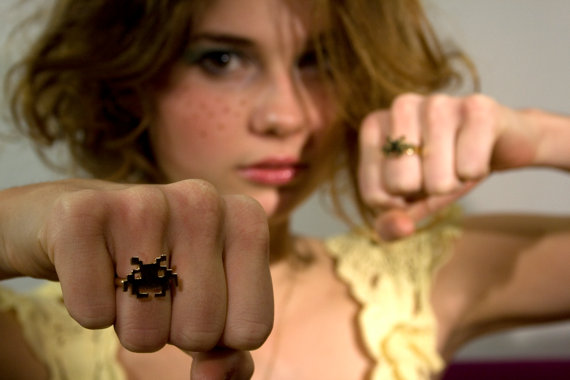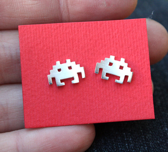 When I saw this picture on EPIC Ponyz this morning, I had to wonder what other wearable art inspired by one of my favorite 1980s video games, Space Invaders, had to exist out there. (My favorite, because the 1980s was the last time I played video games and also because I cannot play video games.) Well, I was in luck, and so are you! Because in addition to that ring above (by Etsy user Virginie Millefiori), there is a whole world of retro 8-bit aliens with which to adorn yourself.