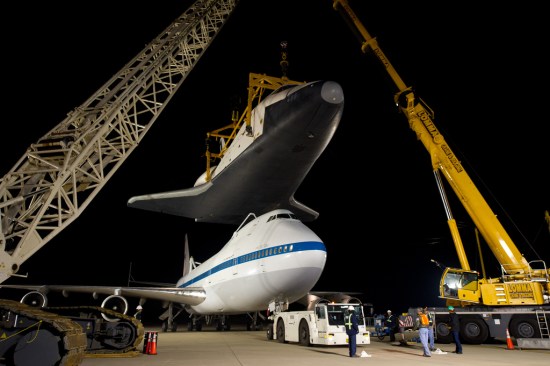 So while Enterprise may not be as exciting as a true spacecraft, it played an enormous role in getting the Shuttles from paper to the launch pad. It’s slated to be flown out to New York’s JFK airport on this coming Monday, likely engaging in the same kind of dramatic photo-op flybys as Discovery. After it’s arrival, Enterprise will be loaded on a barge and sailed around Manhattan to its final home at the Intrepid Sea, Air, and Space Museum — which is mostly housed on the aircraft carrier U.S.S. Intrepid, permanently docked in the Hudson river.