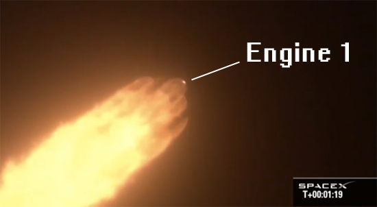 The whole thing can be seen in the following slow-motion video. About 28 seconds in, Engine 1 goes out in a blaze of glory.