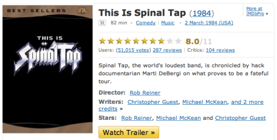 The Internet Movie Database has a cute easter egg for those that know the oft-cited Spinal Tap joke: The band’s amps go up to 11, so now the rating on their movie’s IMDB page does as well.