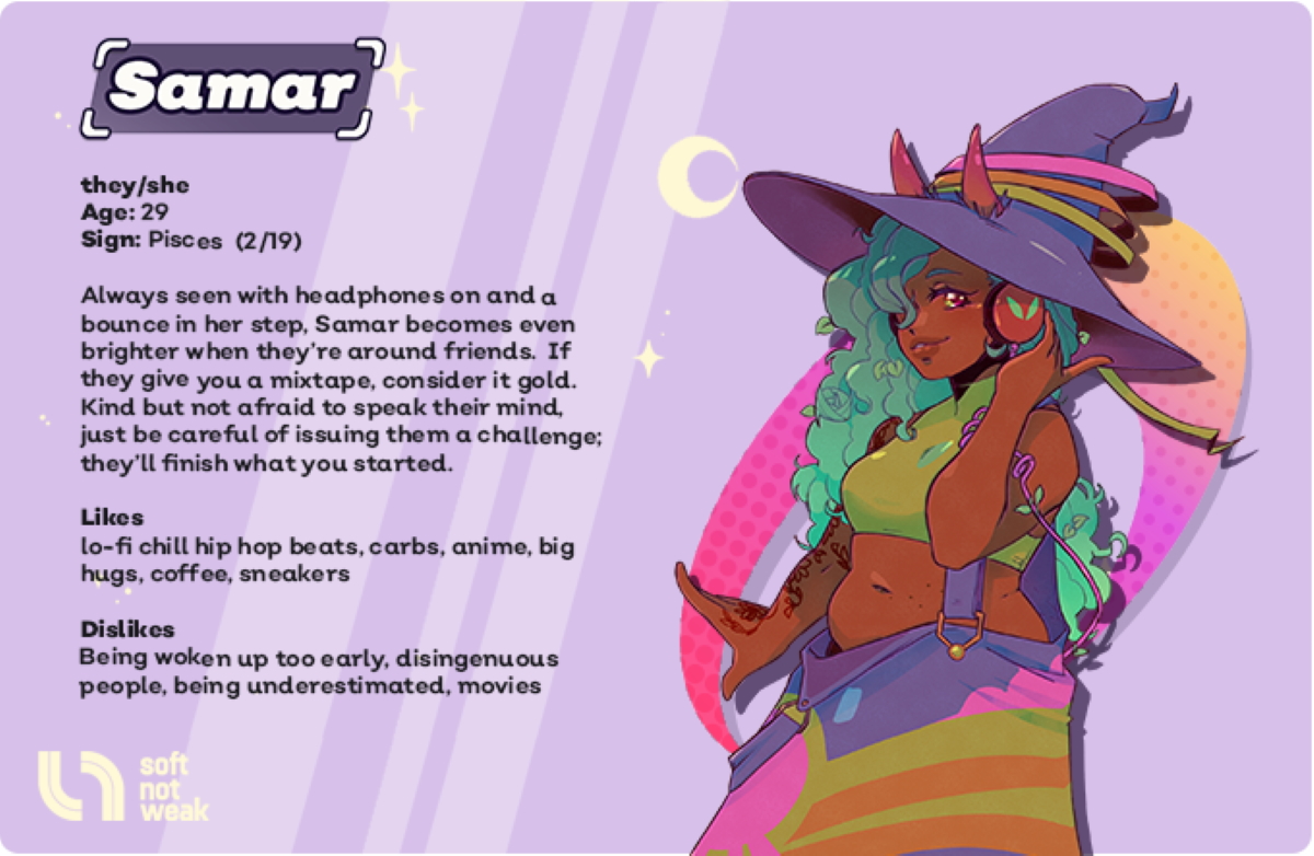 Cast spells, be queer, & crash the biggest concert of the year! Spirit Swap is an action-puzzle game set in a lush, narrative-driven world of witchy demons. Samar is a young witch working the spirit-swapping night shift in the eastern outskirts of Demashq. A recent spike in spirits crossing over from another dimension breaks the chill atmosphere of their night shift. With her trusty familiarZ by her side, she sets off into the city to find out what’s happened. With the popular band, 5SOME, scheduled to kick off their big comeback tour in Demashq, Samar needs to work quickly before the city is overrun with stans and spirits alike….not to mention, they’ve got a pizza party to plan!