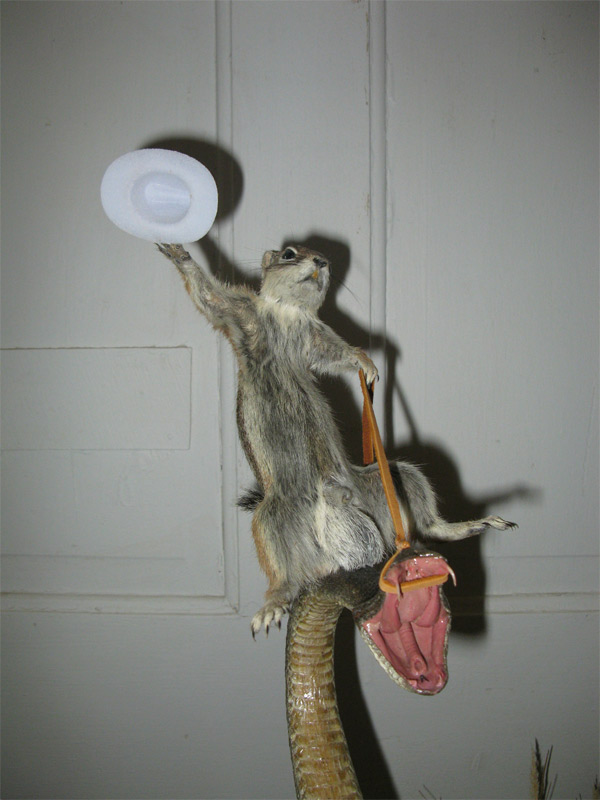 It’s a cold, dreary Thursday, and now that Daylight Saving Time has hit, you can add “dark way too early” to your Thursday adjectives. So, to brighten up (or ruin, we guess) your day, we wanted to let you know that this taxidermied squirrel with a cowboy hat riding a rattlesnake exists.