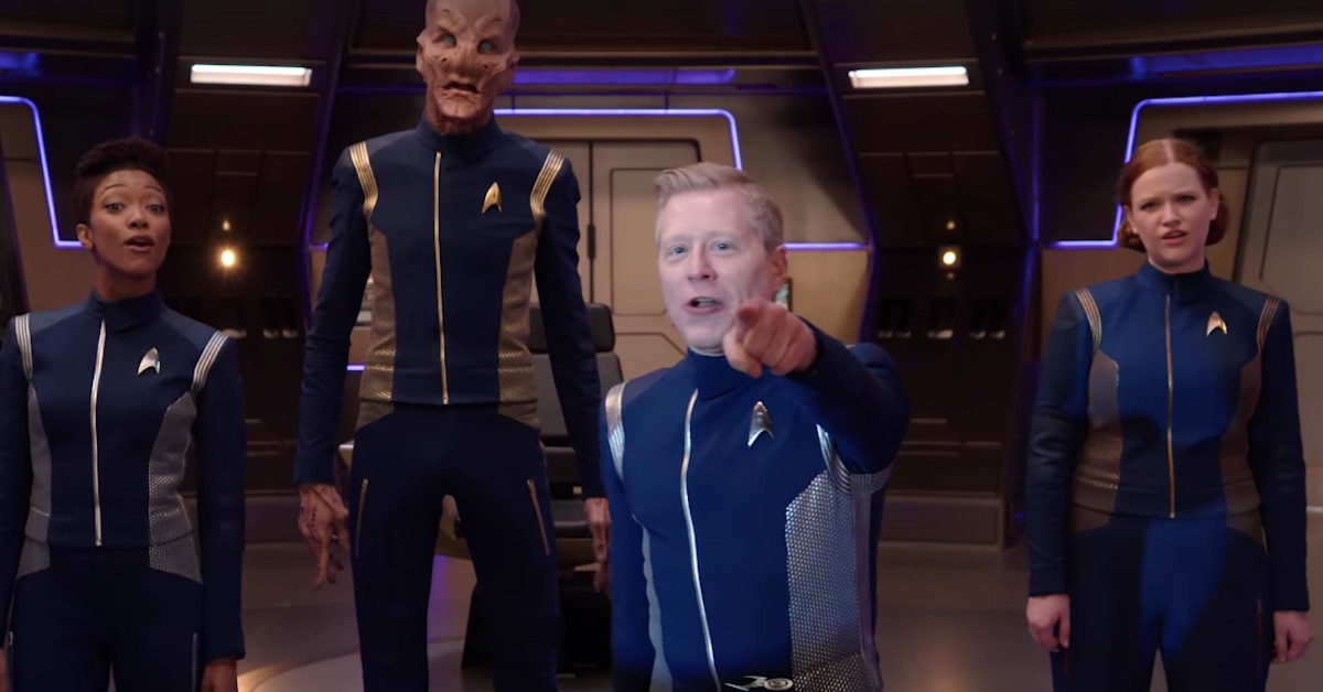 In the clip posted to the official Star Trek Facebook video page, Anthony Rapp (Stamets) is joined by Sonequa Martin-Green (Michael Burnham), Doug Jones (Saru), and Mary Wiseman (Sylvia Tilly) on Discovery‘s bridge. They sing a tongue-in-cheek Star Trek-themed version of “Seasons of Love,” anchored by Rapp: