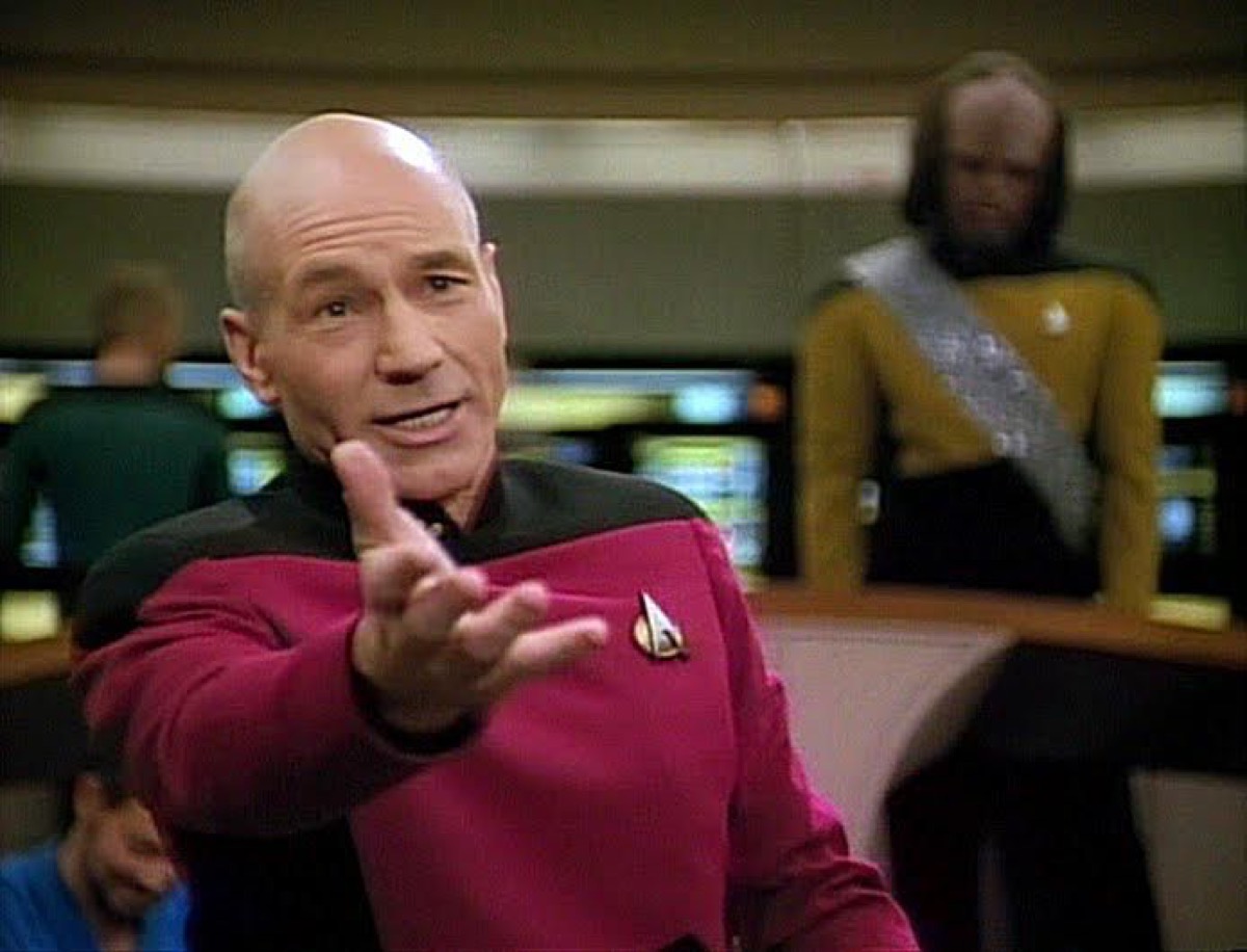 One was pockets. “There are no pockets in Star Trek uniforms,” he says, “as there are no pockets in Elizabethan tights. And so, as Captain Picard, I was the one member of the cast and crew who knew what to do with his hands, which of course is nothing.”