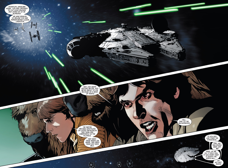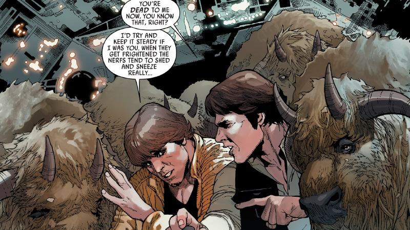 It’s one of the most oft-quoted Star Wars lines…but have you ever wondered why Leia calls Han a “scruffy-looking nerf herder?” Well, you can thank Marvel and their continually awesome Star Wars comic for providing some much-needed back story. *SPOILERS IF YOU’RE NOT CURRENT WITH THE COMICS, YO!*