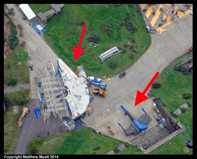 Well, well, well, lookie what we have here. A flying school in England, Airbourne Aviation, posted this shot to Twitter yesterday of what seems to be an aerial shot of the Star Wars: Episode VII set. And it just happens to show the previously teased Millennium Falcon and an X-Wing (?). But guess what? A few shots of another famous mode of transportation have also made their way out of the Batman v Superman: Dawn of Justice set.