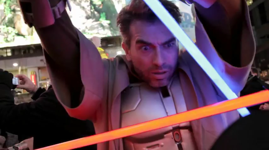 In honor of the release of what BioWare hopes will be the next big MMORPG, Star Wars: The Old Republic, they staged a freeze mob in the middle of Times Square in New York City. The stunt featured some costumed Jedi and Sith, duking it out and freezing in dramatic poses. There’s a surprise twist to the mob that was pretty fun, so you should probably check out the video — along with (hilarious) shots of what we felt were the highlights of the video — below.