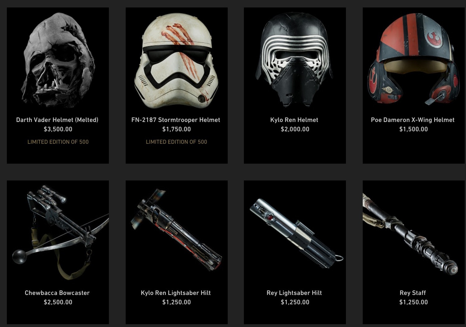 Lucasfilm is selling amazingly detailed prop replicas made by the talented folks at PropShop (who worked on the film). The collaboration gives collectors and fans the opportunity to own an FN-2187 Stormtrooper Helmet, a Kylo Ren Helmet, Poe Dameron’s X-Wing Helmet, Rey’s staff, and even a limited edition melted Darth Vader helmet that Emo Kylo Ren could only dream of reciting Hamlet to.