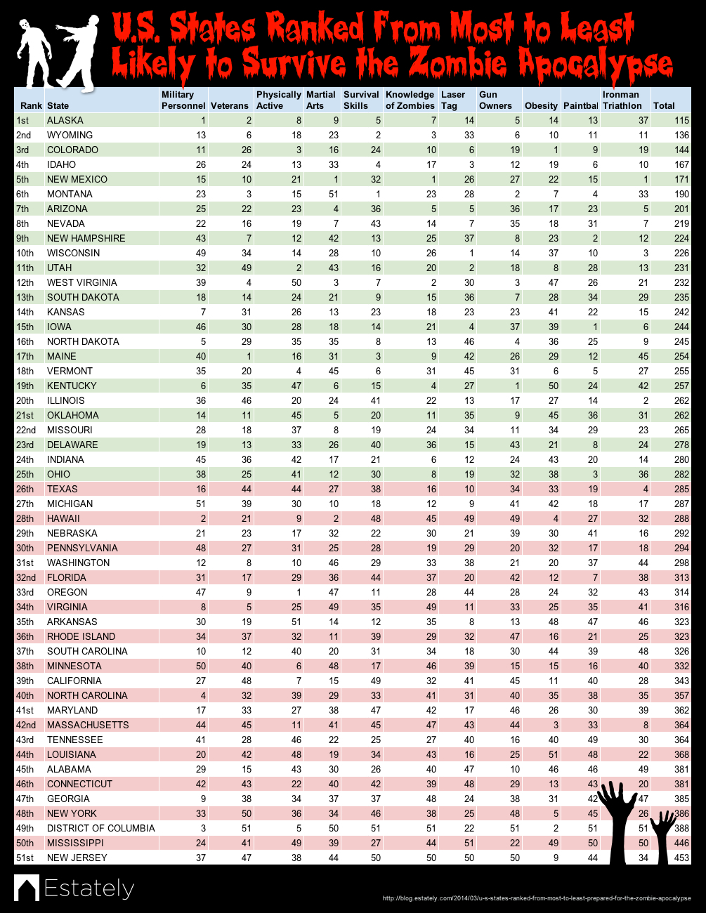 Estately’s incredibly comprehensive analysis of our national preparation for zombie disaster used 11 categories to measure a state’s threat level, looking at residents’ physical fitness, knowledge of zombies, and access to weapons. Factors examined included laser tag’s popularity in a given state, percentage of military veterans, and number of Evil Dead-heads. The results were calculated and then turned into this essential list, take a look and see if you need to start planning your route to Terminus: