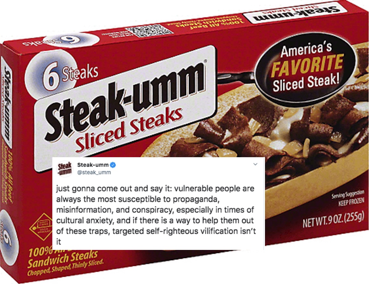 These tweets went viral, proving Steak-umm’s thesis that “our society values entertainment over truth and that’s a huge problem,” but luckily for us—since we do live in a society where this is the case—the incisive mind behind the frozen meat account continued to amplify important messages and methods of critical thinking. I’d much rather Allebach and Steak-umm have the stage than, say, Fox News.
