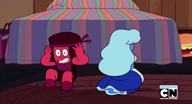 In the darkest moments of conflict, Steven seems to serve as an almost abstract idea for the Gems: he’s the innocent to be protected, he’s the link between Gems and humans, he’s the remains of Rose. And while they undeniably love him, they also seem to have trouble grasping that he’s growing up, that he’s aware of and affected by their actions and behaviors. Ruby and Sapphire’s elemental powers are a deft visual metaphor for the emotional damage Steven’s been suffering from the tension in the Gem household: neither of them mean to hurt him, and may not even notice that something exuding from them without conscious thought on their part would affect someone else. They’re even trying to humor Steven in the midst of their argument, clearly thinking they’re successfully keeping him out of it. But Steven still gets scalded. He still gets cold. And the fact that they didn’t mean to do it doesn’t make the effects any less tangible. Divorce stories in media have touched on this subject matter before, of course, but there’s something uniquely gut-punching to it when we’ve spent so long coming to love this cast only to now have to watch them hurt each other.