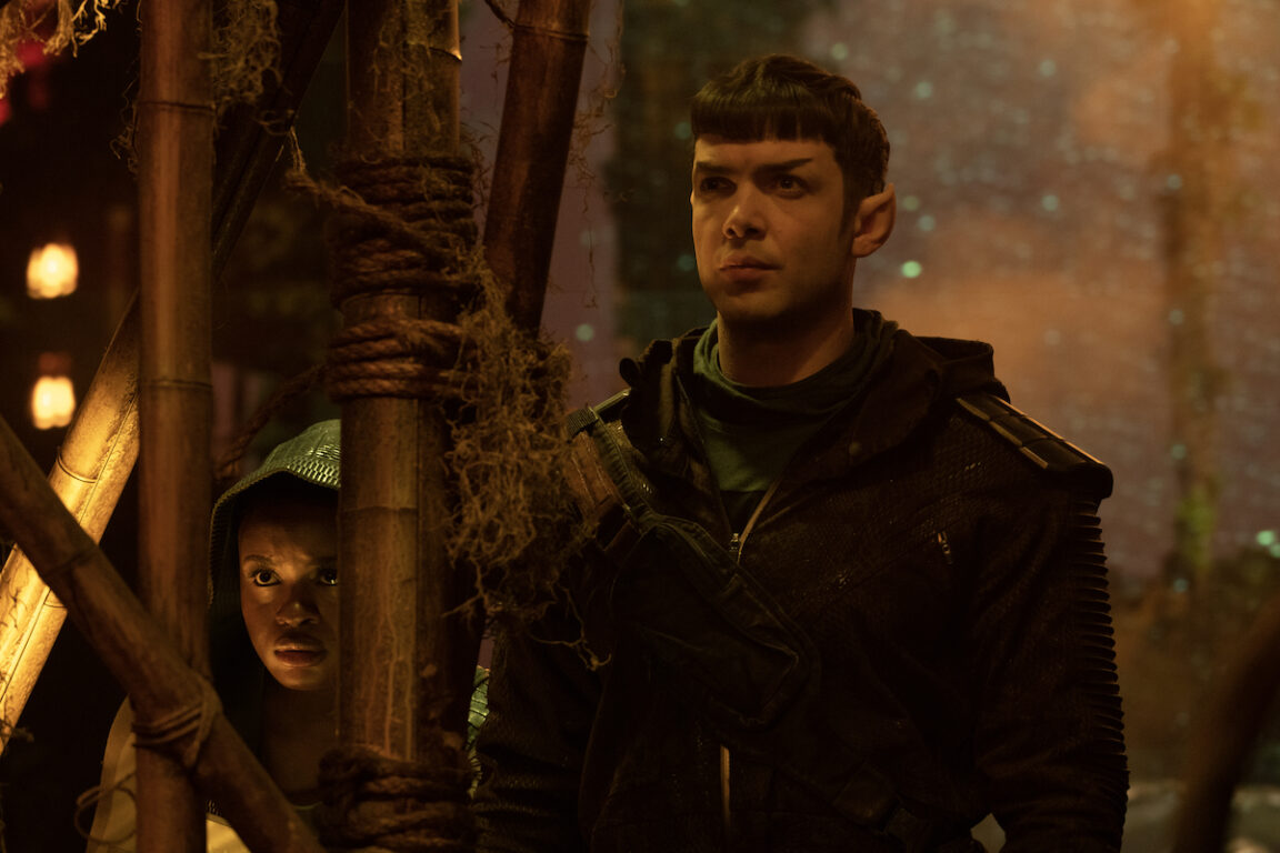 It’s also interesting what each person’s choice of attire says about their character. Uhura is the youngest, so of course her outfit is cute, stylish, and she could just as easily go to the club in it after this mission. La’an is moving around secretly trying to get information, so long coats and multiple hoods make sense. Spock is, well, Spock, so it makes sense that his outfit is the most utilitarian of all of them while adhering to the culture they’re infiltrating.