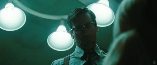 Around the 0:19 mark, partway through the series of flashing images, who did we miss but Mad Men‘s Don Draper (Jon Hamm) himself, looking dapper as always, but also rather creepy in those spectacles as he looms over Babydoll (Emily Browning), who has been confined to an insane asylum by her stepfather. Hamm plays a mysterious gambling man named High Roller, and reportedly transforms into the owner of the brothel in Babydoll’s dream world.