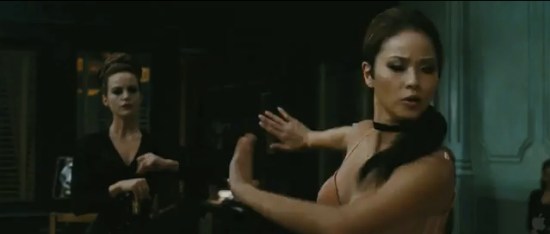 Sure, you get a longer look at Madam Gorski (Carla Gugino), and at Amber (Jamie Chung) and her gunslingin’ companions later, dressed–er, undressed–in … revealing costumes, but you may have missed this quick shot, in which it appears Amber, another one of the wards at the mental institution, is rebuffing Gorski, a Polish psychiatrist in the real world that becomes the madam of the brothel in Babydoll’s fantasy.