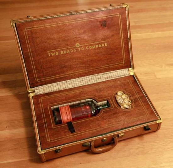 A gentleman by the name of Tyler Riewer is fortunate to have the best friends on the planet. As a birthday gift, they created a custom suitcse fitted to hold a set of brass knuckles and a bottle of Bulleit Bourbon. The custom case features the words “Life is a daring adventure, or nothing,” on the exterior along with the phrase “sack up.” Inside, presumably an indicator that the contents are meant to prepare one for said adventure is the legend, “two roads to courage.”
