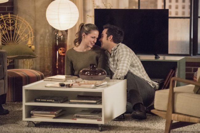 • THE MORNING AFTER. Apparently, after Supergirl gets some nookie, she really needs to save some people. Mon-El wakes up in her apartment alone, and when he watches the news, he sees that she’s already saved four different sets of people and delivered some puppies. Supergirl comes flying in the window bearing flowers and coffee for Mon-El, then changes back into Kara, very chipper. They agree that they had a great time last night, but whereas Mon-El would like to lie in and spend the day together, Responsible Kara wants them to get to work, difficult though it is. Mon-El tells her that he’d like to wake up with her sometime. Kara asks him to keep their relationship quiet at the DEO so that she can have this be hers without being picked apart by everyone she knows. He agrees  …