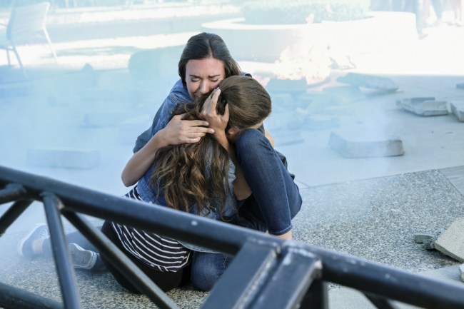 - Meanwhile, on the ground below, a woman named Sam (Odette Annable) and her young daughter Ruby (Emma Tremblay) accidentally bump into Alex before going closer to the stage to watch the statue unveiling. Over their coms, Alex and Maggie address why Alex has been so resistant to wedding planning lately. Alex reveals that she’s really sad that her father won’t be able to be there to walk her down the aisle, so a big wedding doesn’t feel right. Maggie reminds her that they have a chosen family of wonderful people who will make their day special. Cute couple moment, which Winn overhears.