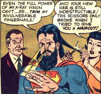 “But you mentioned red kryptonite!” you yell. Yes. Yes I did. The above picture is the product of red kryptonite. To get rid of his indesctructable hair, Superman whistles for Krypto (and Supergirl; kinda creepy) and they use their laser vision to get rid of it before anyone can say “Hey! Clark grew a beard and ponytail, too!”