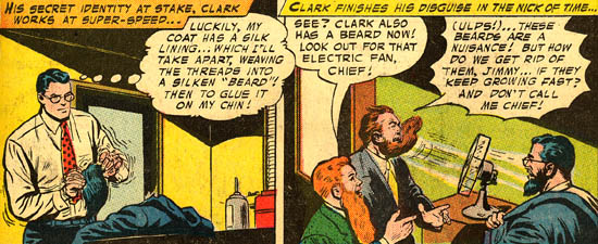 Of course if he’s not evil at the time and therefore can’t grow a five-o’clock-shadow on demand, Superman can still be quite resourceful. These panels are from an issue where Perry White, Jimmy Olsen, and Clark Kent have all swallowed a chemical potion that makes beards grow very rapidly. Obviously since chemicals don’t work on him, Clark must fashion a beard from his jacket to protect his secret identity.