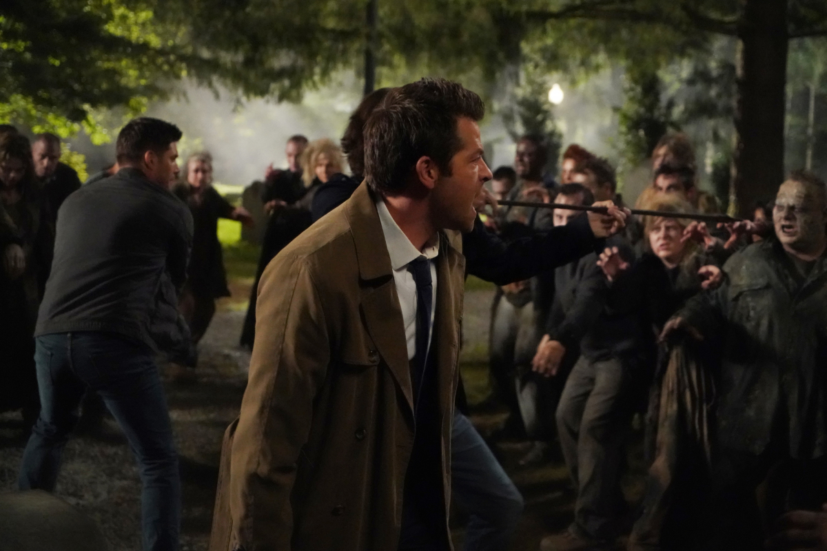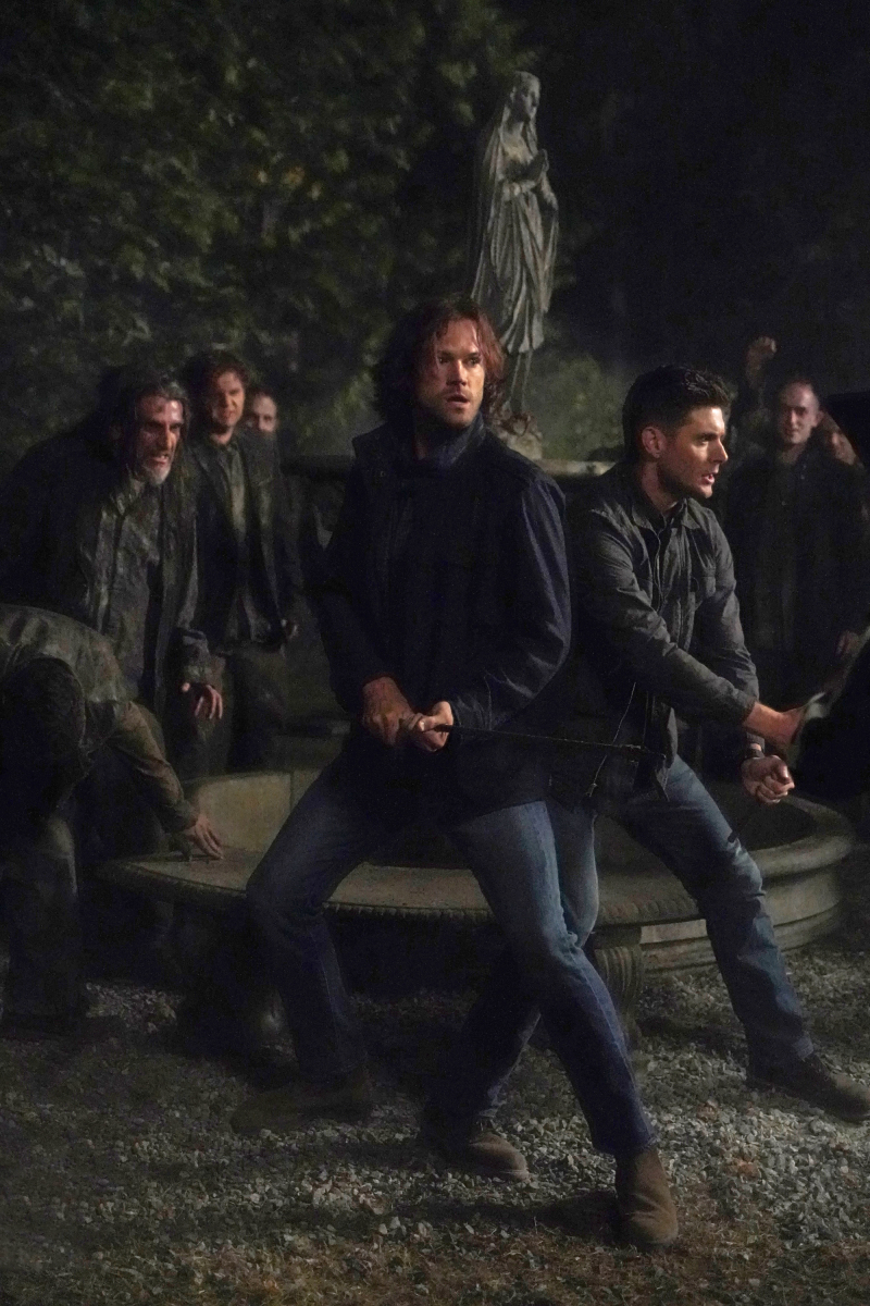 The episode picks up directly where the season fourteen cliffhanger left our boys: facing a horde of hell zombies after personally pissing off God (Rob Benedict). The monsters and ghosts the Winchesters have fought since season one all seem to be back now, from the woman win white they vanquished in the pilot episode to a terrifying killer clown they ganked in episode 300. Sam (Jared Padalecki) and Castiel (Misha Collins) also seem pretty scared of what awaits in a world where God is the enemy.