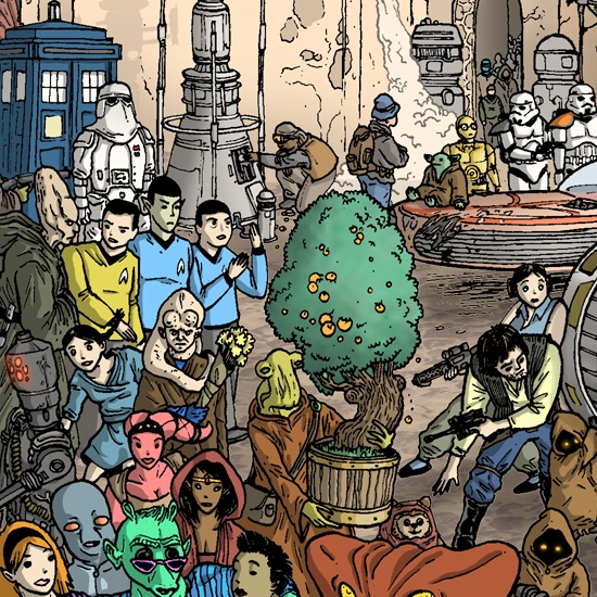 What you see above is only a tiny piece of a larger mural done by Ulises Farinas that depicts Mos Eisley — the most wretched hive of scum and villainy in the Star Wars universe. However, this version of the Tatooine crossroads of ne’er-do-wells is full of characters from other science fiction series. You’ll see just about every Star Wars character from the original trilogy in the image, as well as some visitors from Star Trek, Doctor Who, Teenage Mutant Ninja Turtles, The Simpsons, Predator, Batman, The Wizard of Oz, Fallout, and many more besides. It’s a veritable Where’s Waldo Lando of Sci-Fi goodness.