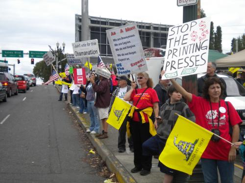 Update: A little more evidence that the slogan was legitimate: The Next Web has what looks like an email exchange with the head of the Oregon Tea Party. Note that the response is from 3:03 PM, so the sender would have to be in Europe or another time zone east of EDT for this to be legit.