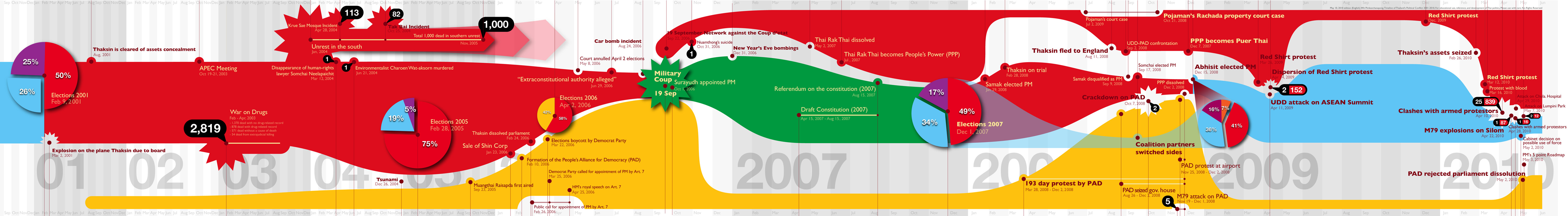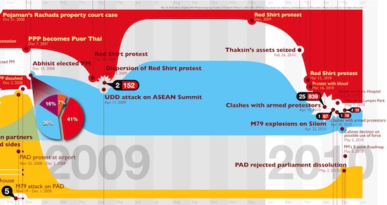 Designer Wit Pimkanchanapong has created this handy and well-designed political timeline of Thai events since 2001: It will quickly get you up to speed on election results, major political events, and death tolls in the numerous clashes throughout the decade.